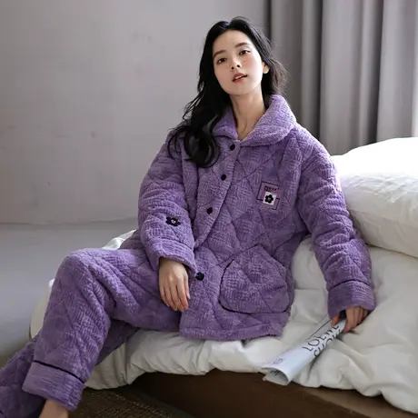 婷美秋冬季新款睡衣女士珊瑚绒三层夹棉款加厚高档家居服保暖套装